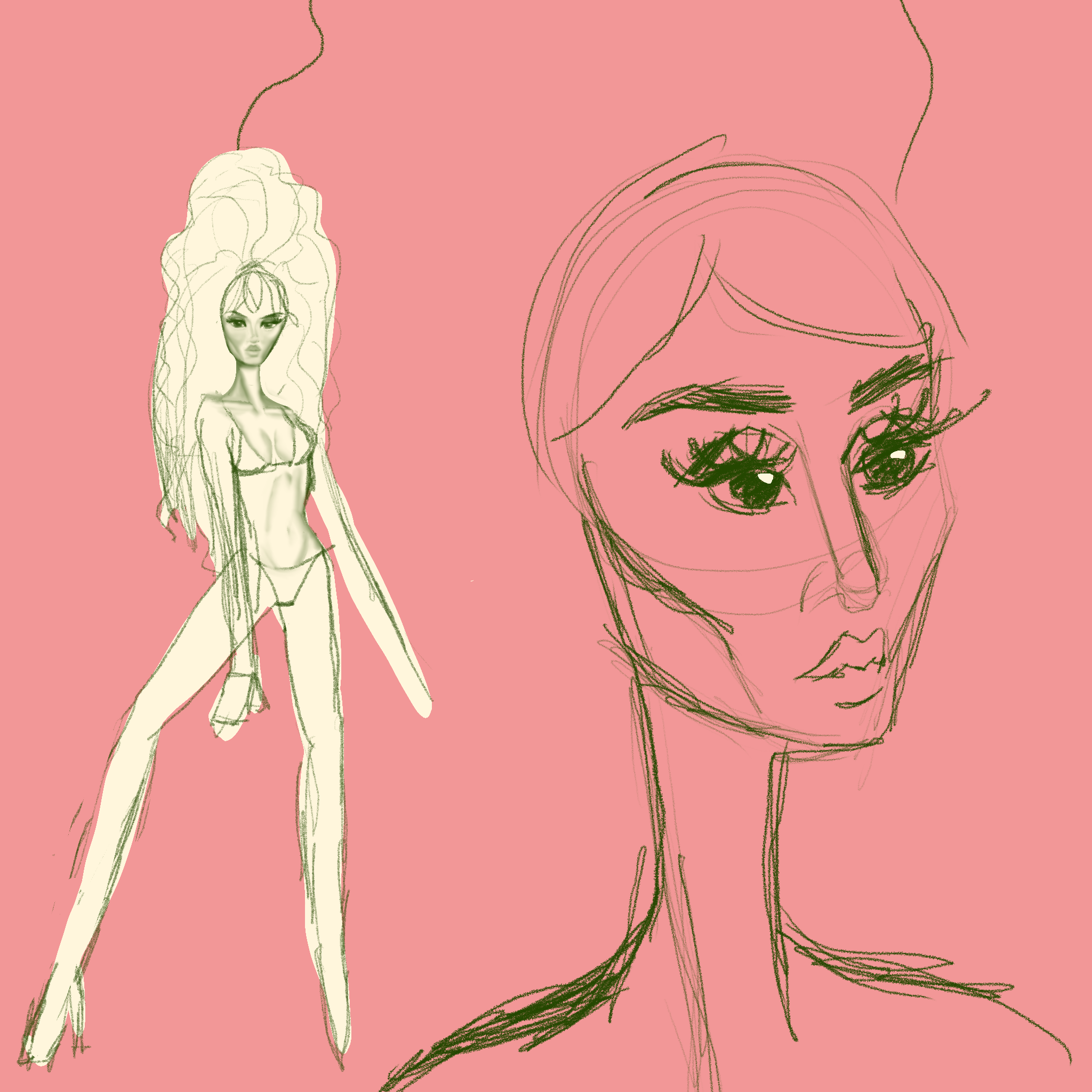 She loves an extra big ass ponytail and a side swept bang. She has a slender face. It’s defined and angular, but still soft. She’s very sleek, with lots of long lines. Before I make a 3D model I’ll usually do some 2D art to get a quicker feel for what I want. The hair in these sketches is a lot wavier and curlier then what I ended up modeling. I might go back and change the model idk art is a process or shwhatever
