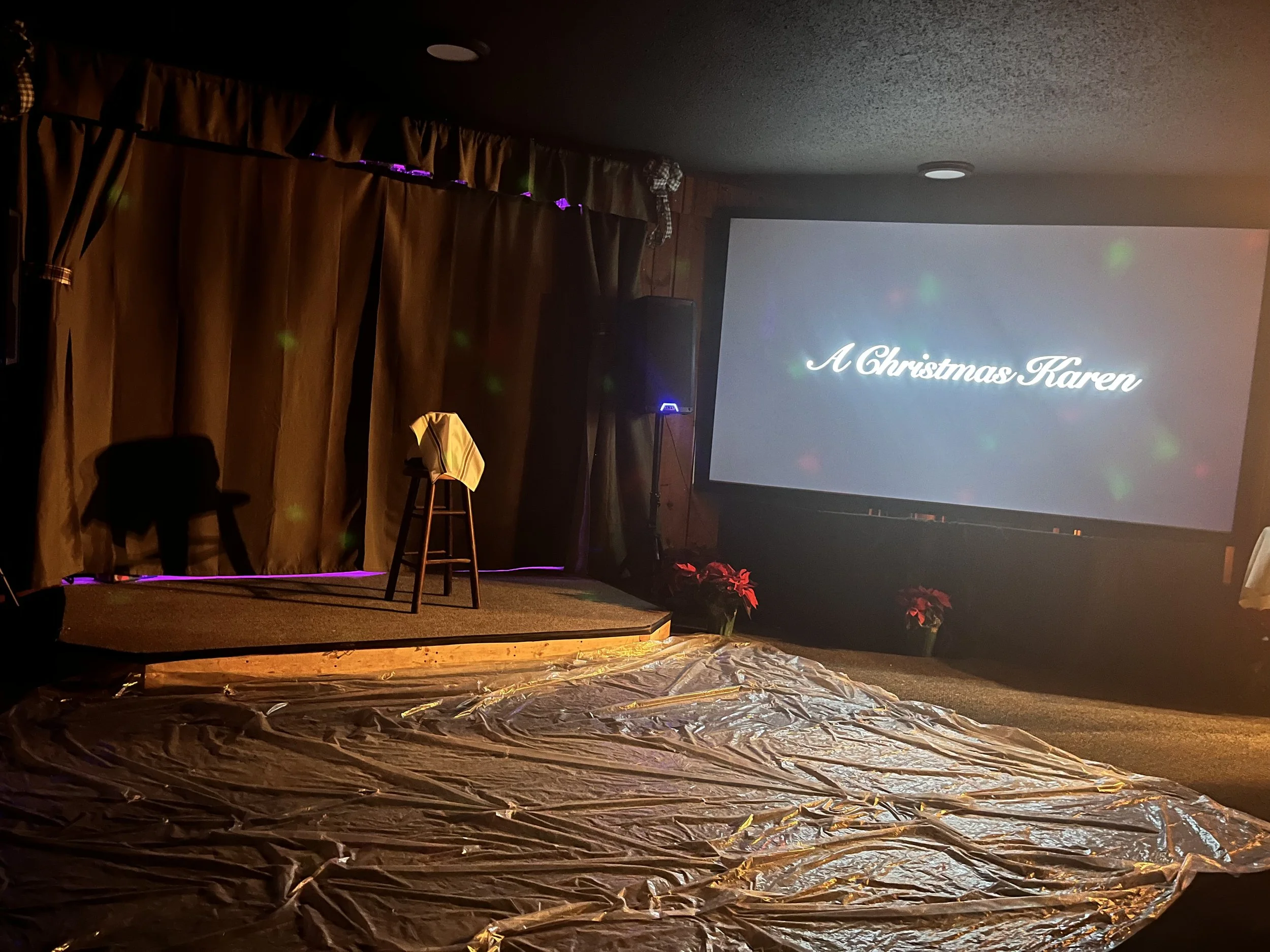 The show took place in the Goldenrod Inn’s Cabaret Room. After performing at so many bars that swallow sound, I immediately appreciated this space. It was large enough to seat about 75, yet intimate enough for performers to be heard even when they weren’t using microphones. It was like a blackbox theater inside a remote lodge. A large plastic tarp gave me the impression that someone would be making a mess soon…