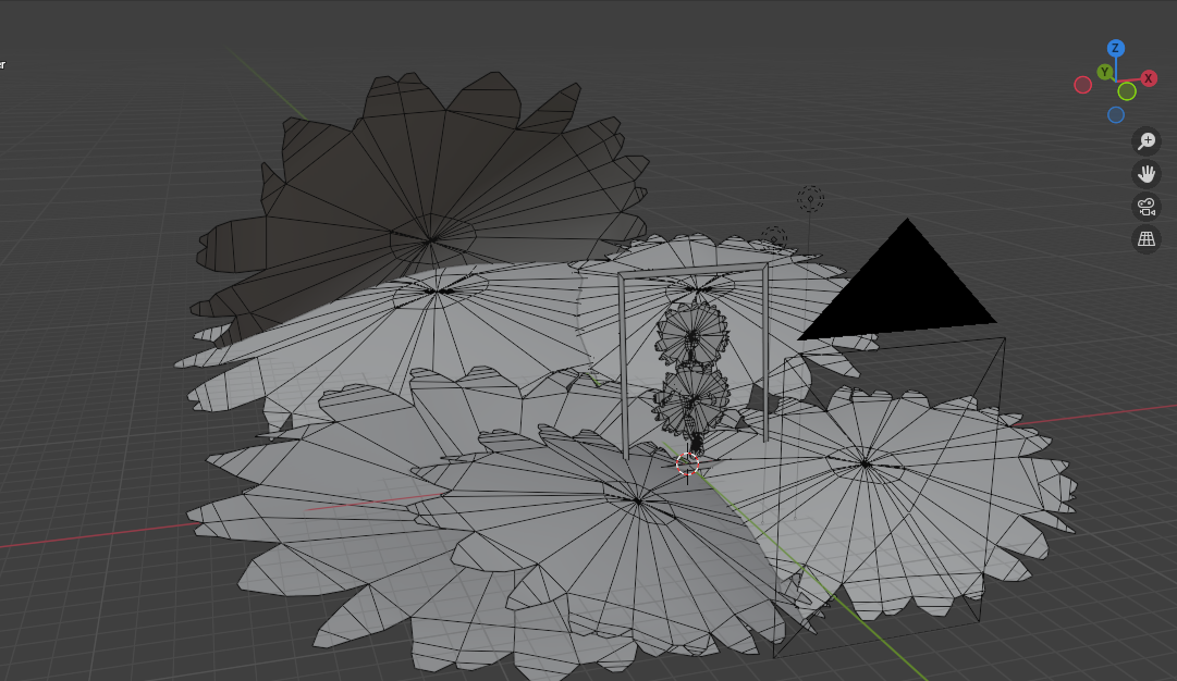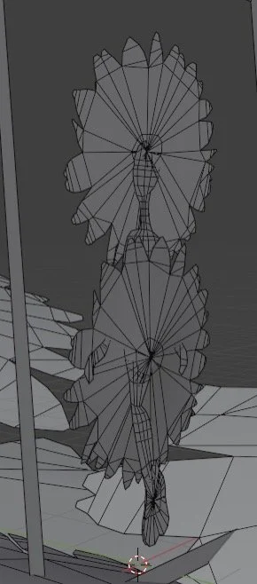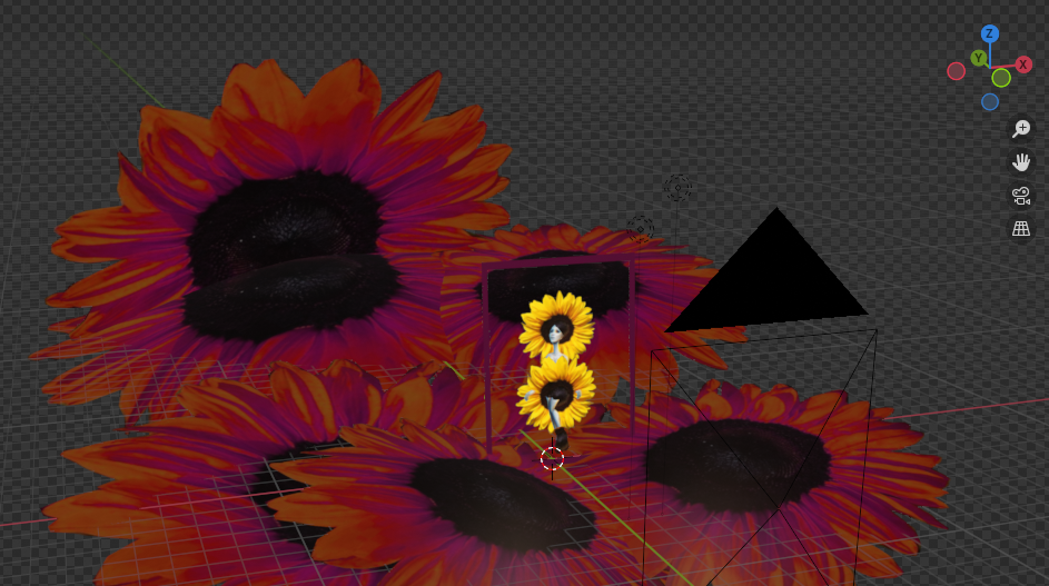 The redder sunflowers use the same image, but scaled up large and given a hill shape. The color and value were adjusted using shaders, meaning the computer calculates how to adjust it without affecting the original. I could hypothetically use this to animate color changes.